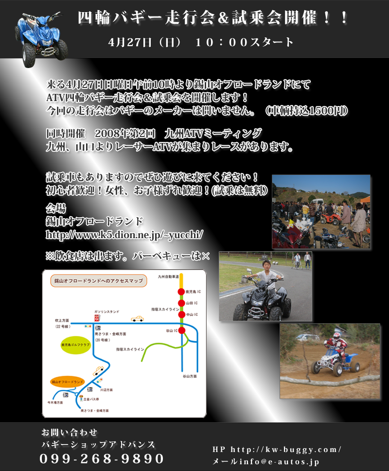 kwバギー ユナリATVの販売店「オートガレージアドバンス」と申します。新商品の紹介やカスタムの注意点などを日記も混ぜながら紹介していきます。ご意見・ご感想・質問などありましたらいつでもご連絡下さい!